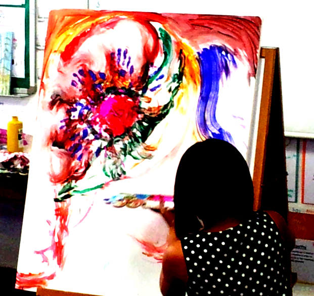 She has a lot of emotion when she paints. She uses emotions and paints very abstract art.